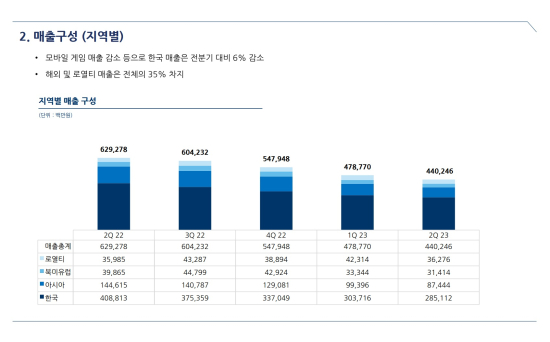 °ÔÀÓº° ¸ÅÃâ·Î´Â '¸®´ÏÁö M'ÀÌ Àü³â µ¿±â ºñ±³ 9.55%¡¤Á÷Àü ºÐ±â ºñ±³ 1.84% °¨¼ÒÇÑ 1,277¾ï ¿ø, '¸®´ÏÁö 2M'ÀÌ Àü³â µ¿±â ºñ±³ 35.56%¡¤Á÷Àü ºÐ±â ºñ±³ 15.13% °¨¼ÒÇÑ 620¾ï ¿ø, 'ºí·¹À̵å & ¼Ò¿ï 2'°¡ Àü³â µ¿±â ºñ±³ 69.83%¡¤Á÷Àü ºÐ±â ºñ±³ 14.89% °¨¼ÒÇÑ 42¾ï ¿ø, '¸®´ÏÁö W'°¡ Àü³â µ¿±â ºñ±³ 54.01%¡¤Á÷Àü ºÐ±â ºñ±³ 16.1% °¨¼ÒÇÑ 1,028¾ï ¿øÀ» ±â·ÏÇß´Ù. PC ¿Â¶óÀÎ °ÔÀÓÀº Àü³â µ¿±â ºñ±³ 8.05%¡¤Á÷Àü ºÐ±â ºñ±³ 3.53% °¨¼ÒÇÑ 882¾ï ¿øÀ» ±â·ÏÇß´Ù.
