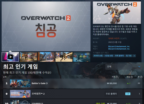 ¾×ƼºñÀü ºí¸®Àڵ尡 °³¹ßÇÏ°í ¼ºñ½ºÇÏ´Â ¿Â¶óÀÎ FPS '¿À¹ö¿öÄ¡ 2'°¡ ¹ëºê°¡ ¿î¿µÇÏ´Â ±Û·Î¹ú PC °ÔÀÌ¹Ö Ç÷§Æû ½ºÆÀ(Steam)¿¡ Ãâ½ÃµÆ´Ù. Ãâ½Ã ù³¯ ¼ºÀûÀº ±Û·Î¹ú ¸ÅÃâ ¼øÀ§ 9À§, µ¿½Ã Á¢¼ÓÀÚ ¼øÀ§´Â 14À§, À¯Àú ÆòÁ¡Àº '´ëü·Î ºÎÁ¤Àû'À» ±â·ÏÇß´Ù.
