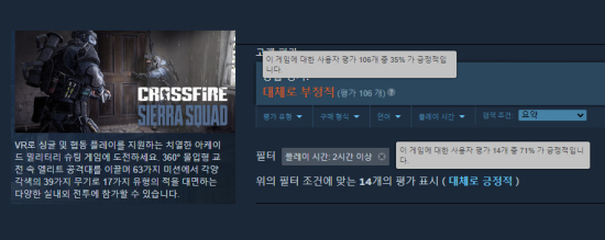 ½º¸¶ÀϰÔÀÌÆ® ¿£ÅÍÅ×ÀÎ¸ÕÆ®°¡ °³¹ßÇÑ VR FPS 'Å©·Î½ºÆÄÀ̾î: ½Ã¿¡¶ó ½ºÄõµå'°¡ 8¿ù 29ÀÏ ±Û·Î¹ú µ¿½Ã Ãâ½ÃµÈ °¡¿îµ¥, ¹ëºê°¡ ¿î¿µÇÏ´Â ±Û·Î¹ú PC °ÔÀÌ¹Ö Ç÷§Æû ½ºÆÀ¿¡¼ '´ëü·Î ºÎÁ¤Àû' Æò°¡¸¦ ¹Þ°í ÀÖ´Ù. ±×·¯³ª 2½Ã°£ ÀÌ»ó Ç÷¹ÀÌÇÑ À¯Àúµé·ÎºÎÅÍ´Â '´ëü·Î ±àÁ¤Àû'À» ȹµæÇß´Ù.