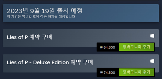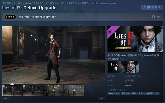 ³×¿ÀÀ§Áî°¡ 9¿ù 19ÀÏ ±Û·Î¹ú Ãâ½Ã ¿¹Á¤ÀÎ ¾×¼Ç RPG ¡®PÀÇ °ÅÁþ¡¯ÀÌ ½ºÆÀ(Steam)¿¡¼ 1¸¸ ¿ø¿¡ ÆÇ¸ÅµÆ´Ù. Ãâ½Ã Àü 3ÀÏ ¸ÕÀú Ç÷¹ÀÌÇÏ´Â ´ë½Å ½ºÅÄ´Ùµå ¿¡µð¼Çº¸´Ù 1¸¸ ¿ø ºñ½Ñ µð·°½º ¿¡µð¼ÇÀÌ ½ºÆÀ °áÁ¦ ½Ã½ºÅÛ ¼³Á¤ ¹®Á¦·Î 9¿ù 16ÀÏ »õº® 1½Ã°æ±îÁö 1¸¸ ¿ø¿¡ ÆÇ¸ÅµÇ´Â ¿À·ù°¡ ¹ß»ýÇß´Ù. ¿À·ù´Â °íÃÄÁø »óÅ´Ù.
