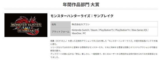 À̿ܿ¡µµ ¿ì¼ö»ó¿¡´Â ´ÑÅÙµµ 'Á¦³ëºí·¹À̵å 3'°ú '½ºÇ÷¡Å÷ 3', ĸÄÞ '¸ó½ºÅÍ ÇåÅÍ ¶óÀÌÁî: ¼±ºê·¹ÀÌÅ©'¿Í '¹ÙÀÌ¿À ÇÏÀÚµå RE:4', ¼¼°¡ '¼Ò´Ð ÇÁ·ÐƼ¾î', ½ºÄù¾î ¿¡´Ð½º 'Å©¶óÀ̽ýº ÄÚ¾î -ÆÄÀ̳ΠÆÇŸÁö VII- ¸®À¯´Ï¿Â'°ú 'ÆÄ¶ó³ë¸¶ »çÀÌÆ® FILE23', ¼Ò´Ï ÀÎÅÍ·¢Æ¼ºê ¿£ÅÍÅ×ÀÎ¸ÕÆ® '°« ¿Àºê ¿ö ¶ó±×³ª·ÎÅ©', µð½½¸® 'Áö±¸¹æÀ§´ë 6', °ÔÀÓÇÁ¸®Å© 'Æ÷Äϸó½ºÅÍ ½ºÄ®·¿¡¤¹ÙÀ̿÷¿', ¿ö³Êºê¶ó´õ½º 'È£±×¿ÍÆ® ·¹°Å½Ã' µî 11°³ ÀÛǰÀÌ ¼±Á¤µÆ´Ù.