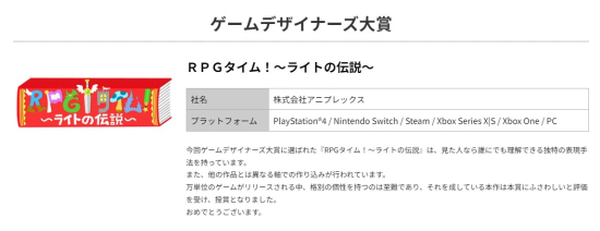 °ÔÀÓ µðÀÚÀÌ³Ê ´ë»óÀº ¾Ö´ÏÇ÷º½º 'RPG ŸÀÓ! ~¶óÀÌÆ®ÀÇ Àü¼³~ÀÌ ¼ö»óÇß´Ù. °ÔÀÓÀ» ÁÁ¾ÆÇÏ´Â ¾î¸°¾ÆÀ̰¡ ³ëÆ®¿¡ ±×¸²À» ±×·Á ¸¸µç °ÔÀÓÀ» Ç÷¹ÀÌÇÑ´Ù´Â ÄÁ¼ÁÀ¸·Î °³¹ßµÈ ÀÛǰÀÌ´Ù. ÁÖÃÖÃøÀº "ÇÑ ÇØ¿¡ ¼ö¸¸°³¿¡ ´ÞÇÏ´Â °ÔÀÓÀÌ Ãâ½ÃµÇ´Â °¡¿îµ¥ °³¼ºÀûÀÎ °ÔÀÓÀ» ¸¸µå´Â °Ç ¾î·Æ´Ù"¶ó¸ç, "±× ¾î·Á¿î ÀÏÀ» ÇØ³½ ÀÛǰÀÌ °ÔÀÓ µðÀÚÀ̳ʽº ´ë»ó¿¡ ¾î¿ï¸°´Ù°í Æò°¡¹ÞÀ¸¸ç ½Ã»óµÆ´Ù"¶ó°í ¼³¸íÇß´Ù.