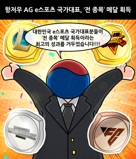 ¿ì¸®³ª¶ó e½ºÆ÷Ã÷ ±¹°¡´ëÇ¥°¡ ±¹Á¦ ½ºÆ÷Ã÷ ´ëȸ ¡®Á¦19ȸ Ç×Àú¿ì ¾Æ½Ã¾È °ÔÀÓ(AG)¡¯¿¡¼ ÃâÀüÇÑ ³× Á¾¸ñ ¸ðµÎ ¸Þ´ÞÀ» ȹµæÇß´Ù. ¡®¸®±× ¿Àºê ·¹Àüµå(LoL)¡¯¿Í ¡®½ºÆ®¸®Æ® ÆÄÀÌÅÍ 5¡¯´Â ±Ý¸Þ´Þ, ¡®¹èƲ±×¶ó¿îµå ¸ð¹ÙÀÏ¡¯Àº Àº¸Þ´Þ, ¡®FC ¿Â¶óÀÎ(ÇÇÆÄ ¿Â¶óÀÎ 4)¡¯Àº µ¿¸Þ´ÞÀÌ´Ù.