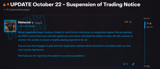10¿ù 23ÀÏ 'µð¾Æºí·Î IV' Ä¿¹Â´ÏƼ ¸Å´ÏÀú´Â "¹ö±× ¾Ç¿ëÀ¸·Î ÀÎÇØ ÃßÈÄ °øÁö°¡ ÀÖÀ» ¶§±îÁö 'µð¾Æºí·Î IV'¿¡¼ À¯Àú°£ °Å·¡ ±â´ÉÀ» Áß´ÜÇÑ´Ù"¶ó¸ç, "¶ÇÇÑ °ñµå ¹× ¾ÆÀÌÅÛ º¹Á¦ ¹ö±×¸¦ ¾Ç¿ëÇÏ´Â µ¥ ¿¬·çµÈ ¸ðµç °èÁ¤Àº ¿î¿µ Á¤Ã¥¿¡ µû¶ó Á¦Àç ¹Þ°Ô µÈ´Ù"¶ó°í ¸»Çß´Ù.