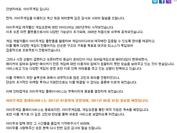 7¿ù 5ÀÏ, NHN ÇѰÔÀÓÃøÀº 6¿ù 30ÀÏ¿¡ °øÁö»çÇ×À» ÅëÇØ ¡®¾ÆÀ̵ΰÔÀÓ¡¯ÀÇ ¼ºñ½º Á¾·á¸¦ 8¿ù 1ÀÏ·Î °áÁ¤Çß´Ù°í ¹àÇû´Ù.