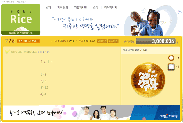 ¿£¾¾¼ÒÇÁÆ®´Â WFP¿Í ÇÔ²² ½ÒÀ» ±âºÎÇÒ ¼ö ÀÖ´Â ±â´É¼º °ÔÀÓÀÎ 'ÇÁ¸®¶óÀ̽º(Freerice)'Çѱ¹¾î ¹öÀüÀ» Ãâ½ÃÇß´Ù°í ¹àÇû´Ù. "±â¾Æ ÇØ°áÀ» µ½´Â »õ·Î¿î ¹æ¹ý"À̶ó´Â ¸ðÅä·Î ÁøÇàµÇ°í ÀÖ´Â ÇÁ¸®¶óÀ̽º(freerice.plaync.co.kr/ko.freerice.com)´Â ¿µ¾î´Ü¾î, ¿¬»ê±âÃÊ, ±¹°¡, ÈÇÐ, ¹®ÇÐ µî 15°³ Ä«Å×°í¸®ÀÇ ÄûÁî °ÔÀÓÀ¸·Î ÀÌ¿ëÀÚ°¡ ¸Å¹ø Á¤´äÀ» ¸ÂÃâ ¶§¸¶´Ù 10ÅçÀÇ ½Ò¾ËÀ» Àû¸³, ÈÄ¿ø ±â¾÷À» ÅëÇØ ½ÒÀ» ±âºÎÇÏ´Â ±â´É¼º °ÔÀÓÀ¸·Î, ±â¾ÆÅðÄ¡ ¿îµ¿ ÇÏ·çµµ ¾ÈµÅ °ÔÀ̸ӵéÀÇ ÀÚ¹ßÀûÀÎ Âü¿©·Î 300¸¸ÅçÀ» µ¹ÆÄÇÏ¿´´Ù.