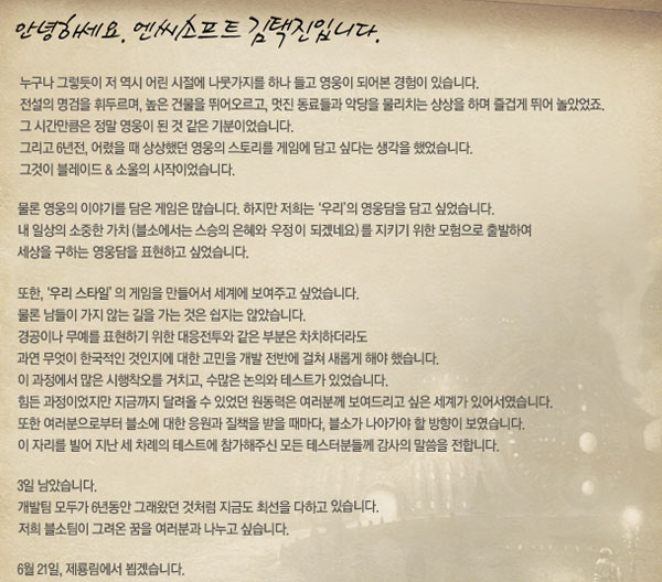 NC ±èÅÃÁø ´ëÇ¥, ¡°ºí·¹ÀÌµå¾Ø¼Ò¿ïÀº ¾î¸° ½ÃÀýÀÇ ²ÞÀ» ã´Â °ÔÀÓ¡±