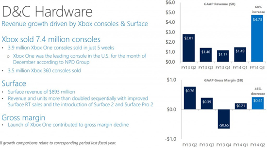 ¸¶ÀÌÅ©·Î¼ÒÇÁÆ®°¡ ÇöÁö ½Ã°¢ 23ÀÏ ¹ßÇ¥ÇÑ 2014³â ȸ°è¿¬µµ 2ºÐ±â ÃÑ ¸ÅÃâÀº Àü³â ´ëºñ(214¾ï 6000¸¸ ´Þ·¯, ÇÑÈ ¾à 24Á¶) ¾à 14% Áõ°¡ÇÑ ¼öÄ¡ÀÌÀÚ ½ÃÀå Àü¹®°¡µéÀÇ ¿¹»óÄ¡ÀÎ 236¾ï 8õ¸¸ ´Þ·¯¸¦ »óȸÇß´Ù. ¿¹»ó »óȸÀÇ ÁÖ¿ªÀº Áö³ÇØ ÇϹݱâ Ãâ½ÃµÈ Â÷¼¼´ë °ÔÀÓ±â XBOX ONEÀÇ ÆÇ¸Å È£Á¶°¡ ÄÇ´Ù.