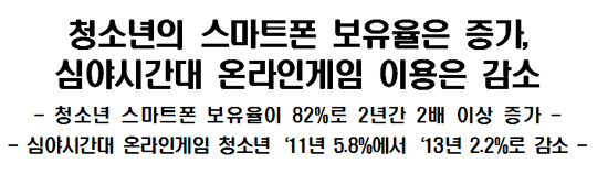 ¹Ý¸é, û¼Ò³âÀÇ ½É¾ß ½Ã°£´ë ¿Â¶óÀΰÔÀÓ ÀÌ¿ë·üÀº 11³âµµ 5.8%¿¡¼­ 13³â 2.2%·Î, 3%°¡·® °¨¼ÒÇß´Ù. ƯÈ÷ °ÔÀÓÀÌ¿ëÇüŵµ Â÷À̸¦ º¸¿´´Ù. ÄÄÇ»ÅÍ·Î °ÔÀÓ °æÇèÀÌ ÀÖ´Ù´Â ÀÀ´ä·üÀº ³²³à ¸ðµÎ °¨¼ÒÇßÀ¸¸ç, ÈÞ´ëÀüÈ­¸¦ ÀÌ¿ëÇÏ¿© °ÔÀÓÀ» ÇÑ °æÇèÀº ³²³à ¸ðµÎ Áõ°¡Çß´Ù.