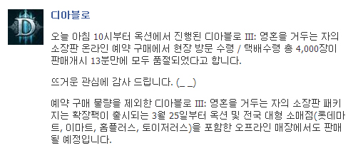 ºí¸®ÀÚµåÄÚ¸®¾Æ´Â ¿À´Ã(13ÀÏ) °ø½Ä ÆäÀ̽ººÏÀ» ÅëÇØ ¿ÀÀü 10½Ã ¿Á¼Ç¿¡¼ ´Üµ¶À¸·Î ÁøÇàµÈ ¡®µð¾Æºí·Î 3: ¿µÈ¥À» °ÅµÎ´Â ÀÚ¡¯ ¼ÒÀåÆÇ ¿Â¶óÀÎ ¿¹¾à ±¸¸Å°¡ ¸ðµÎ ǰÀýµÇ¾ú´Ù°í ÀüÇß´Ù. ÁغñµÈ ÃÑ 4,000ÀåÀÇ ¹°·®Àº ºÒ°ú 13ºÐ ¸¸¿¡ ÇöÀå ¹æ¹® ¼ö·É ¹× Åùè¼ö·É±îÁö ¸ðµÎ µ¿³ °Í.