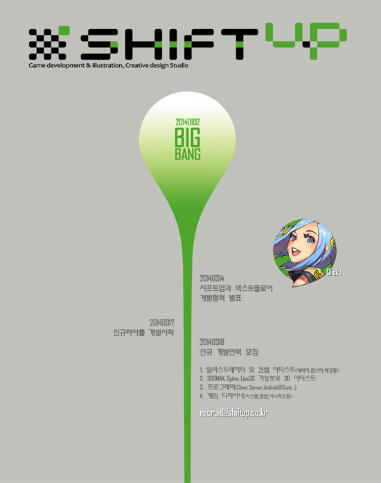 ÇÑÆí, ¾ç»çÀÇ Ã¹ ¹øÂ° °øµ¿ °³¹ß ÁßÀÎ ½ÅÀÛ Å¸ÀÌÆ²Àº ¿Ã ÇϹݱâ Ãâ½Ã¸¦ ¸ñÇ¥·Î Çϰí ÀÖÀ¸¸ç, ½ÃÇÁÆ® ¾÷Àº °øµ¿°³¹ß ¹ßÇ¥¿¡ ´ëÇÑ ¼Ò°³¿Í ÇÔ²² ½Å±ÔÀη ä¿ëÀ» ÁøÇàÇϰí ÀÖ´Ù. ÀÚ¼¼ÇÑ »çÇ×Àº °ø½Ä ȨÆäÀÌÁö(http://www.shiftup.co.kr)¿¡¼ È®ÀÎÇÒ ¼ö ÀÖ´Ù.