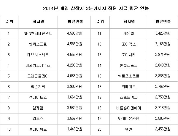 ÇÏÁö¸¸ ÀÌ·³¿¡µµ ºÒ±¸ÇÏ°í ¿©ÀüÈ÷ À¥Á¨Àº Á÷¿øµéÀÇ ±Þ¿© ¼öÁØÀº ÄÚ½º´Ú¿¡ »óÀåµÇ¾î ÀÖ´Â °ÔÀÓ»ç Áß ÃÖÇÏÀ§¿¡ ÃÄÁö°í ÀÖ´Â °ÍÀ¸·Î ³ªÅ¸³µ´Ù. 1À§¿¡ ·©Å©µÇ¾î ÀÖ´Â NHN¿£ÅÍ¿Í 3ºÐ±â±îÁö Áö±Þ ¿¬ºÀ Æò±ÕÀÌ 2,050¸¸ ¿øÀÇÀÇ Â÷À̸¦ º¸À̰í ÀÖ´Â °Í.
