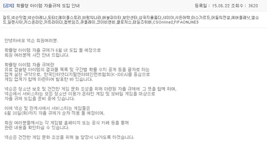 ³Ø½¼Àº 23ÀϺÎÅÍ È®·üÇü ¾ÆÀÌÅÛ ÀÚÀ²±ÔÁ¦¸¦ ½Ç½ÃÇϸç, ¼­ºñ½ºÇϰí ÀÖ´Â °ÔÀÓ 45Á¾ Áß 39Á¾¿¡ 30ÀϱîÁö ÀÚÀ²±ÔÁ¦¸¦ µµÀÔÇÒ ¿¹Á¤ÀÌ´Ù. ÀÚÀ²±ÔÁ¦ Àû¿ë ´ë»ó¿¡¼­ Á¦¿ÜµÈ °ÔÀÓ 4Á¾Àº À¯·á È®·üÇü ¾ÆÀÌÅÛÀ» »ó½ÃÆÇ¸ÅÇÏÁö ¾Ê´Â <¸¶ºñ³ë±â ¿µ¿õÀü>°ú <»çÀÌÆÛÁî>, <ÄĹî¾ÏÁî>, <Å¥Ç÷¹ÀÌ>´Ù.