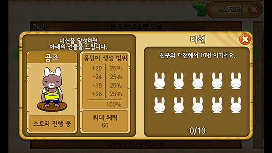 ¡ß (ijÁÖ¾ó) µ¨¸®½´¾î ¡®Ä³·Ô ºù°í for Kakao¡¯ ¡ß µ¨¸®½´¾î°¡ ¼ºñ½ºÇÏ´Â <ij·Ô ºù°í for Kakao>´Â 1:1 ´ëÀü ¹æ½ÄÀ¸·Î ÁøÇàµÇ´Â ºù°í °ÔÀÓÀÌ´Ù. À̰ÔÀÓÀº Çʵ带 ¼±ÅÃÇØ 5ÁÙÀ» ¸ÕÀú ¸¸µå´Â ±âº» ºù°í·ê¿¡ ¡®Åä³¢±¼¡¯ ¹× ¡®¾çµ¿ÀÌ¡¯ ½Ã½ºÅÛÀ» ´õÇß´Ù. ¡®Åä³¢±¼¡¯Àº ·£´ý Ãâ¸ôÇϸç À̸¦ ÀÌ¿ëÇØ ´Ù¼öÀÇ Çʵ带 ¼öÈ®ÇÒ ¼ö ÀÖ´Ù. ¶ÇÇÑ ÁÙÀ» ¿Ï¼ºÇÒ ¶§¸¶´Ù »ó´ë Çʵ忡 Àå¾Ö¹°À» ³õ¾Æ ¹æÇØÇÒ ¼ö ÀÖ´Â ¡®¾çµ¿ÀÌ¡¯ ½Ã½ºÅÛÀÌ Æ¯Â¡ÀÌ´Ù.
