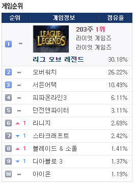 PC¹æ Àα⠼øÀ§ Á¡À¯À² 1À§¸¦ 203ÁÖ° ±â·ÏÇϰí ÀÖ´Â '¸®±× ¿Àºê ·¹Àüµå(ÀÌÇÏ LOL)'¸¦ '¿À¹ö¿öÄ¡'°¡ ¹ÙÀÛ µÚÂѰí ÀÖ´Ù.