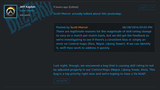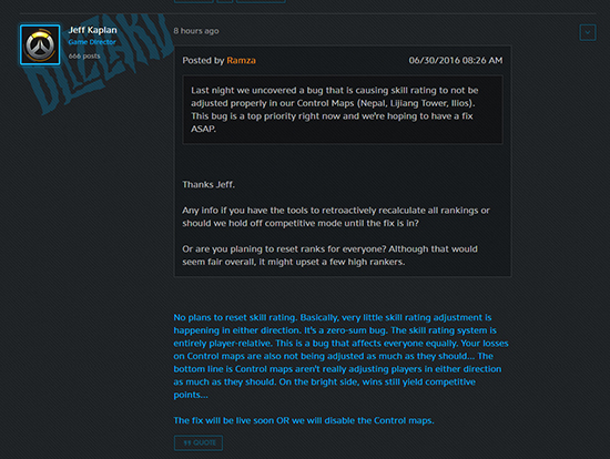 ÀÌ¾î °°Àº ±ÛÀÇ ´Ù¸¥ ´ä±Û(http://us.battle.net/forums/en/overwatch/topic/20745755424?page=3#post-58)¿¡¼´Â "ÇöÀç ½Ç·ÂÆòÁ¡À» ÃʱâÈÇÒ °èȹÀº ¾ø´Ù"¸ç "À̹ø¿¡ ¹ß»ýÇÑ ¹ö±×ÀÇ °æ¿ì ½ÂÆÐ¿¡ »ó°ü¾øÀÌ ¸ðµÎ¿¡°Ô ¹ö±×°¡ ¶È°°ÀÌ Àû¿ëµÇ´Â 'Á¦·Î¼¶' ¹ö±×·Î, ¹ö±×¸¦ °ð ¼öÁ¤Çϰųª 'ÀïÅ»Àü'¸ÊÀ» '°æÀïÀü'¿¡¼ Á¦¿ÜÇϰڴÙ"¶ó°í ÀǰßÀ» ³²°å´Ù.