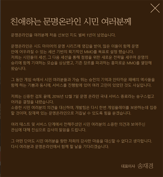 Ä£¾ÖÇÏ´Â ¹®¸í¿Â¶óÀÎ ½Ã¹Î ¿©·¯ºÐ²², ¹®¸í ¿Â¶óÀÎÀ» ¿©·¯ºÐ²² óÀ½ ¼±º¸ÀÎ Áöµµ ¹ú½á 1³âÀÌ ³Ñ¾ú½À´Ï´Ù. ¹®¸í ¿Â¶óÀÎÀº ½Ãµå ¸¶À̾îÀÇ ¹®¸í ½Ã¸®Áî¿¡ ¿µ°¨À» ¹Þ¾Æ, ¸¹Àº À̵éÀÌ ÇÔ²² ¹®¸í ¾È¿¡ ¾î¿ì·¯Áú ¼ö ÀÖ´Â ¼¼¼Ç ±â¹ÝÀÇ È¹±âÀûÀÎ MMO¸¦ ¸ñÇ¥·Î ¼³Á¤ Çß½À´Ï´Ù. ÀúÈñ´Â ½Ã¹ÎµéÀÌ ¼¼¼Ç, ±× ´ÙÀ½ ¼¼¼ÇÀ» ÅëÇØ Á¡·ÉÀ» À§ÇÑ »õ·Î¿î Àü·«À» ¼¼¿ì¸ç ¹®¸íÀÇ ½Â¸®¿¡ ÇÔ²² ±â¿©ÇÏ´Â ¸ð½ÀÀ» »ó»óÇß°í, ±âÁ¸ À帣¸¦ ÆÄ±«ÇÏ´Â Èï¹Ì·Î¿î MMO¸¦ ¿¸ÁÇØ ¿Ô½À´Ï´Ù. ±× µ¿¾È °ÔÀÓ ¼Ó¿¡¼ ½Ã¹Î ¿©·¯ºÐµé°ú °¡½¿ ¶Ù´Â ½ÂÀüÀÇ ±â¾ï°ú ¾ÈŸ±î¿î ÆÐ¹èÀÇ ¿ª»çµéÀ» ÇÔ²² ÇÏ´Â ±â»Ý°ú µ¿½Ã¿¡, ¼ºñ½º¸¦ ÁøÇàÇÔ¿¡ ÀÖ¾î ¿©·¯ °í¹ÎÀÌ ÀÖ¾ú´ø °Íµµ »ç½ÇÀÔ´Ï´Ù. ÀúÈñ´Â ½ÅÁßÇÑ °ËÅä ³¡¿¡, 2016³â 12¿ù 7ÀÏ ¹®¸í ¿Â¶óÀÎ ±¹³» ¼ºñ½º Á¾·á¶ó´Â ¼Û±¸½º·´°í ¾î·Á¿î °áÁ¤À» ³»·È½À´Ï´Ù. ¼ÒÁßÇÑ ½Ã¹Î ¿©·¯ºÐÀÇ ÀǰßÀ» ´ë½ÅÇÏ¿©, °³¹ßÆÀÀº ´Ù½Ã Çѹø °ÔÀÓÇ÷¹À̸¦ º¸¿ÏÇϴµ¥ ÁýÁßÇÒ °ÍÀ̸ç, ÀáÀç·Â ÀÖ´Â ¹®¸í¿Â¶óÀÎÀ¸·Î °Åµì³¯ ¼ö ÀÖµµ·Ï ÈûÀ» ½ñ°Ú½À´Ï´Ù. ¿©·¯ Å×½ºÆ® ¹× ¼ºñ½º ´Ü°è¿¡¼ ÀüÇØÁ̴ּø ½Ã¹Î ¿©·¯ºÐÀÇ ¼ÒÁßÇÑ Àǰ߰ú º¸¿©Áֽаü½É¿¡ ´ëÇØ Áø½ÉÀ¸·Î °¨»çÀÇ ¸»¾¸À» µå¸³´Ï´Ù. ±× ¾î¶² ´Ü¾îµµ ½Ã¹Î ¿©·¯ºÐÀ» ÇâÇÑ ÀúÈñÀÇ °¨»çÇÑ ¸¶À½À» ´ë½ÅÇÒ ¼ö ¾ø´Ù°í »ý°¢ÇÕ´Ï´Ù. ´Ù½Ã ¿©·¯ºÐ°ú ¹®¸í¿Â¶óÀο¡¼ ÇÔ²² ÇÒ ³¯À» ±â´Ù¸®°Ú½À´Ï´Ù. ´ëÇ¥ÀÌ»ç ¼ÛÀç°æ [¹®¸í ¿Â¶óÀÎ ¼ºñ½º Á¾·á ÀÏÁ¤ ¾È³»] ¢º 2016³â 11¿ù 02ÀÏ (¼ö) - ¹®¸í ¿Â¶óÀÎ ÇÁ¸®¹Ì¾ö »óÁ¡, ¸ð¹ÙÀÏ ±æµå äÆÃ, ·Î±×ÀÎ, ij¸¯ÅÍ Á¤º¸ ¼ºñ½º Á¾·á (¸ð¹ÙÀÏ ¾Û ȨÆäÀÌÁö ¼ºñ½º Á¦°ø) ¢º 2016³â 12¿ù 07ÀÏ (¼ö) - ¹®¸í ¿Â¶óÀÎ °ÔÀÓ ¼ºñ½º Á¾·á - ¸ð¹ÙÀÏ ¾Û ´Ù¿î·Îµå ¹× ¼ºñ½º Á¾·á (iOS / Google Play) - ¹®¸í ¿Â¶óÀÎ PC¹æ ÇýÅà ¼ºñ½º Á¾·á ±×¸®°í 11¿ù 09ÀÏ ¹®¸í ¿Â¶óÀÎÀÇ È¯ºÒ¿¡ °üÇÑ °øÁö°¡ ÀÖÀ» ¿¹Á¤ÀÔ´Ï´Ù. ¾È³»µå¸° ³»¿ëÀ» Âü°íÇÏ½Ã¾î °ÔÀÓ À̿뿡 ºÒÆíÀÌ ¾øÀ¸½Ã±æ ¹Ù¶ø´Ï´Ù.