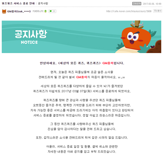 ³Ø½¼Àº °øÁö»çÇ×À» ÅëÇØ "'ÄûÁîÄûÁî'¸¦ ÇâÇØ Å« °ü½É°ú »ç¶ûÀ» Á̴ּø À¯ÀúºÐµé²² Áö¼Ó °¡´ÉÇÑ ÁÁÀº ¼ºñ½º¸¦ Á¦°øÇØ µå¸®±â¿¡ ¹ÌÈíÇÔÀÌ ÀÖ´Ù°í ÆÇ´ÜµÇ¾î ¼ºñ½º Á¾·á¸¦ °áÁ¤ÇÏ°Ô µÇ¾ú´Ù"¸ç "±× µ¿¾È 'ÄûÁîÄûÁî'¸¦ »ç¶ûÇØÁֽŠÀ¯ÀúºÐµé²² Áø½ÉÀ» ´ã¾Æ °¨»çÇÏ´Ù´Â ¸»À» ÀüÇØ µå¸®°í ½Í´Ù"°í ÀüÇß´Ù.