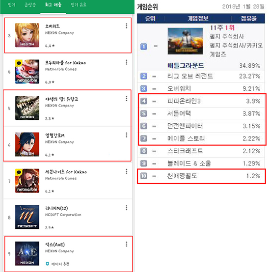 ³Ø½¼ÀÌ ±âÁ¸ ¼­ºñ½º ÁßÀÎ ÀÛǰÀ» »ìÆìº¸¸é PC¿¡¼­´Â ¡®ÇÇÆÄ ¿Â¶óÀÎ 3¡¯°¡ 4À§, ¡®¼­µç¾îÅá¯ÀÌ 5À§, ¡®´øÀü¾ØÆÄÀÌÅÍ¡¯°¡ 6À§, ¡®¸ÞÀÌÇà ½ºÅ丮¡¯°¡ 7À§¸¦ Â÷ÁöÇß°í ¿©±â¿¡ ¡®Ãµ¾Ö¸í¿ùµµ¡¯°¡ »õ·Ó°Ô 10À§¸¦ ±â·ÏÇÏ¸ç ³Ø½¼ °ÔÀÓ 5Á¾ÀÌ TOP 10¿¡ ÁøÀÔÇß´Ù. ¸ð¹ÙÀÏ¿¡¼­´Â ¡®¿À¹öÈ÷Æ®¡¯°¡ ±¸±Û ¸ÅÃâ 3À§, ¾ÖÇà ¸ÅÃâ 5À§, ¡®¾×½º¡¯°¡ ±¸±Û ¸ÅÃâ 9À§, ¡®ÇÇÆÄ ¿Â¶óÀÎ 3 M¡¯ÀÌ ¾ÖÇà ¸ÅÃâ 7À§¸¦ ±â·Ï ÁßÀÌ¸ç ¡®¿­Ç÷°­È£M¡¯, ¡®¾ß»ýÀÇ ¶¥: µà¶û°í¡¯°¡ Àα⸦ ²ø¸é¼­ ³Ø½¼ °ÔÀÓ 4Á¾ÀÌ ¾ç´ë ¸¶ÄÏ ¸ÅÃâ TOP 10À» Â÷ÁöÇϰí ÀÖ´Ù.