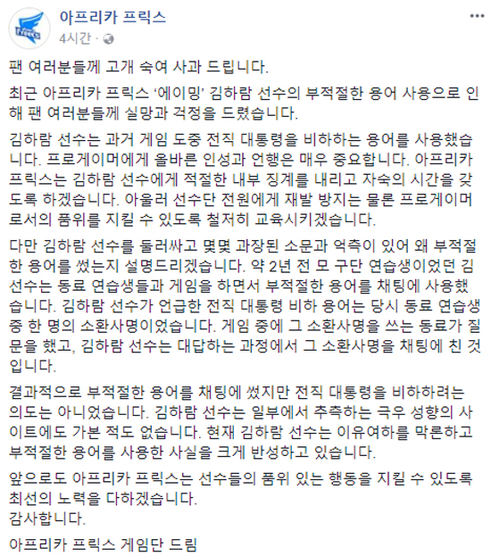 ¾ÆÇÁ¸®Ä« ÇÁ¸¯½º´Â 6ÀÏ °ø½Ä SNS¸¦ ÅëÇØ »ç°ú¹®À» °ÔÀçÇß´Ù. ¾ÆÇÁ¸®Ä« ÇÁ¸¯½º´Â "±èÇ϶÷ ¼±¼ö°¡ °ú°Å °ÔÀÓ µµÁß ÀüÁ÷ ´ëÅë·ÉÀ» ºñÇÏÇÏ´Â ¿ë¾î¸¦ »ç¿ëÇß´Ù"¸ç "ÀûÀýÇÑ ³»ºÎ ¡°è¸¦ ³»¸®°í ÀÚ¼÷ÀÇ ½Ã°£À» °®µµ·Ï ÇϰڴÙ"°í ÀüÇß´Ù.