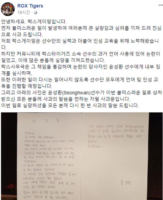 ROX ŸÀ̰ÅÁî´Â 5ÀÏ °ø½Ä SNS¸¦ ÅëÇØ "ºÒ¹Ì½º·¯¿î »ç°Ç ¹ß»ý¿¡ ´ëÇØ ½Ç¸Á°¨°ú ½É·Á¸¦ ³¢Ãĵå·Á Áø½ÉÀ¸·Î »ç°úµå¸°´Ù"¸ç "³í¶õÀÇ ´ç»çÀÚÀÎ À±¼ºÈ¯ ¼±¼ö¿¡°Ô ³»ºÎ ¡°è¸¦ ÇÏ°í ¼±¼ö´Ü ¸ðµÎ¿¡°Ô ¾ð¾î ¹× Àμº±³À°À» ÁøÇàÇϰڴÙ"°í ÀüÇß´Ù. ¶ÇÇÑ, À±¼ºÈ¯ÀÇ ÀÚÇÊ »ç°ú¹®À» µ¿½Ã¿¡ °ÔÀçÇß´Ù.