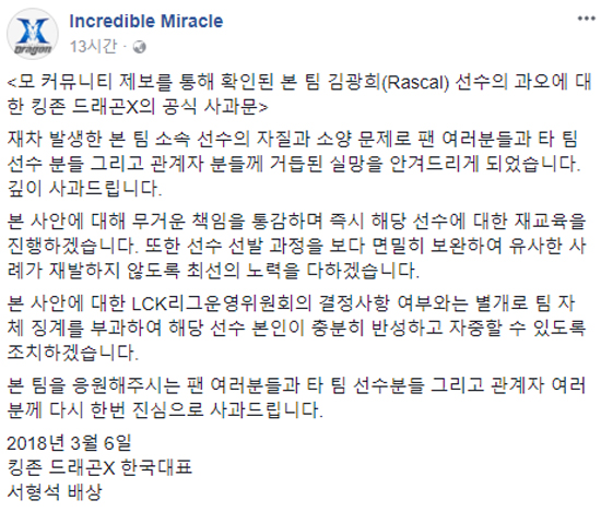 Å·Á¸ µå·¡°ïX´Â ¼Çü¼® Å·Á¸ µå·¡°ïX Çѱ¹´ëÇ¥°¡ 6ÀÏ ¿ÀÀü °ø½Ä SNS¸¦ ÅëÇØ "ÀçÂ÷ ¹ß»ýÇÑ º» ÆÀ ¼Ò¼Ó ¼±¼öÀÇ ÀÚÁú°ú ¼Ò¾ç ¹®Á¦·Î ÆÒ ¿©·¯ºÐµé°ú Ÿ ÆÀ ¼±¼öºÐµé ±×¸®°í °ü°èÀںе鲲 °ÅµìµÈ ½Ç¸ÁÀ» ¾È°Üµå¸®°Ô µÇ¾î ±íÀÌ »ç°úµå¸³´Ï´Ù"¶ó¸ç "LCK¸®±×¿î¿µÀ§¿øÈ¸ÀÇ °áÁ¤»çÇ× ¿©ºÎ¿Í´Â º°°³·Î ÆÀ ÀÚü ¡°è¸¦ ºÎ°úÇÏ¿© ÇØ´ç ¼±¼ö º»ÀÎÀÌ ÃæºÐÈ÷ ¹Ý¼ºÇϰí ÀÚÁßÇÒ ¼ö ÀÖµµ·Ï Á¶Ä¡"ÇÏ°Ú´Ù°í ¹àÇû´Ù.