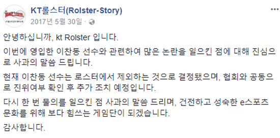 ÇÑÆí, Áö³ÇØ kt ·Ñ½ºÅÍ´Â '2017 LOL èÇǾð½Ê ÄÚ¸®¾Æ' ¼¸Ó ½ÃÁðÀ» ¾ÕµÎ°í '½Ä½º¸Ç'À¸·Î ¿µÀÔÇÑ 'Chance' ÀÌÂùµ¿¿¡°Ô '´ë¸® °ÔÀÓ' ÀÇȤ°ú 'ÀϺ£' ³í¶õÀÌ ºÒ°ÅÁöÀÚ 5¿ù 30ÀÏ °ø½Ä SNS¿¡ »ç°ú¹®À» °ÔÀçÇÏ°í ·Î½ºÅÍ¿¡¼ Á¦¿ÜÇß´Ù.