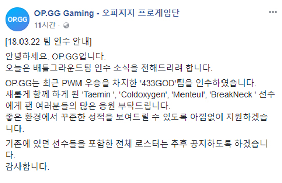 ¿ÀÇÇÁöÁö(OP.GG)´Â 3¿ù 22ÀÏ ¿ÀÇÇÁöÁö ÇÁ·Î°ÔÀÓ´Ü °ø½Ä SNS¸¦ ÅëÇØ 'Ç÷¹À̾î¾ð³ë¿î½º ¹èƲ±×¶ó¿îµå(ÀÌÇÏ PUBG)' ´ëȸ 'PUBG Warfare Masters(PWM)' ÆÄÀÏ·µ¿¡¼ ¿ì½ÂÇÑ ÇÁ·Î°ÔÀÓ´Ü 433 GODÀ» ÀμöÇß´Ù°í ¹àÇû´Ù.
