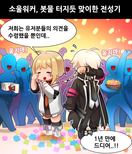 ÀÌÈÄ ¡®¼Ò¿ï¿öÄ¿¡¯´Â PC¹æ Àα⠼øÀ§ 150À§±Ç ¹Û¿¡¼ ²ÙÁØÇÑ ¾÷µ¥ÀÌÆ®·Î ÄÜÅÙÃ÷¸¦ ½×À¸¸ç ÀÌ·¯±¸·¯ ¼ºñ½º 1ÁÖ³âÀ» ¸ÂÀÌÇß´Ù. ÃÊâ±â À¯Àúµé·ÎºÎÅÍ ¹®Á¦Á¡À¸·Î ÁöÀû¹ÞÀº ºÎºÐµµ ´ë´Ù¼ö ¼öÁ¤Çß´Ù. ±×·±µ¥µµ À¯Àú ¼ö´Â Á»Ã³·³ ´ÃÁö ¾Ê¾Ò´Ù. À¯Àú »çÀÌ¿¡¼ ¡®¼Ò¿ï¿öÄ¿¡¯´Â ¿©ÀüÈ÷ °ü½É¹Þ´Â °ÔÀÓÀÌ µÇÁö ¸øÇß´Ù.