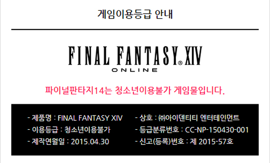 ¾ÆÀ̵§Æ¼Æ¼ ¿£ÅÍÅ×ÀÎ¸ÕÆ®°¡ ¼ºñ½ºÇÏ´Â 'ÆÄÀÌ³ÎÆÇŸÁö14(FINAL FANTASY XIV)'ÀÇ °ÔÀÓÀÌ¿ëµî±ÞÀÌ 'û¼Ò³âÀÌ¿ëºÒ°¡'¿¡¼ '15¼¼ À̿밡'·Î Á¶Á¤µÆ´Ù.