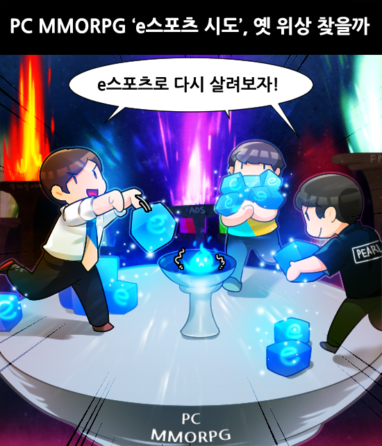 ÇÏÁö¸¸ PC MMORPG¸¦ ¼ºñ½º ÁßÀÎ °ÔÀÓ»ç´Â ¼ÕÀ» ³õÁö ¾Ê¾Ò´Ù. MMORPG¿¡¼ À¯Àú °£ ÀüÅõ´Â ij¸¯Å͸¦ Á¶Á¾ÇÏ´Â À¯Àú°¡ Á÷Á¢ º¼ ¶§¿Í ´Þ¸® Á¦»ïÀÚ°¡ º¸¸é ¸¶Ä¡ ´ëÀü ¾×¼Ç °ÔÀÓÀ» °üÀüÇÏ´Â µíÇÑ ´À³¦À» Áִµ¥, °ÔÀÓ»çµéÀº ¿©±â¿¡ Âø¾ÈÇØ e½ºÆ÷Ã÷ ¸®±×¸¦ È®´ë, ¹ßÀü½ÃÄ×´Ù.