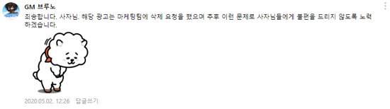 °ø½Ä Ä«Æä À¯Àú »çÀÌ¿¡¼ ÇØ´ç ±¤°í°¡ ³í¶õÀÌ µÇÀÚ, À¯Á¶À̰ÔÀÓÁî´Â ¡°ÇØ´ç ±¤°í´Â ¸¶ÄÉÆÃÆÀ¿¡ »èÁ¦ ¿äûÀ» Çß°í ÃßÈÄ ÀÌ·± ¹®Á¦·Î ºÒÆíÀ» µå¸®Áö ¾Êµµ·Ï ³ë·ÂÇϰڴ١±¶ó°í ´ñ±ÛÀ» ³²°å´Ù. ÀÌ ¿Ü¿¡´Â °øÁö »çÇ×À̳ª °ø½Ä ¹ßÇ¥´Â ¾ø´Â »óÅ´Ù.