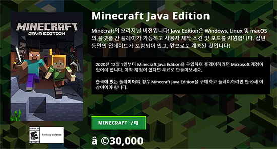 ÀÌ¿¡ µû¶ó MS´Â ¡®¸¶ÀÎÅ©·¡ÇÁÆ® ÀÚ¹Ù ¿¡µð¼Ç¡¯°ú °ü·ÃÇØ ¡°Çѱ¹¿¡ ÀÖ´Â À¯Àú´Â ±¸¸ÅÇϰí Ç÷¹ÀÌÇÏ·Á¸é ¸¸ 19¼¼ ÀÌ»óÀ̾î¾ß ÇÑ´Ù¡±¶ó°í º°µµ ¾È³»¸¦ ¸í½ÃÇϰí ÀÖ´Ù. 2021³â 6¿ù ±âÁØ ¡®¸ðÀå-MS °èÁ¤ ÅëÇÕ¡¯Àº ½ÃÀÛµÇÁö ¾Ê¾Ò´Ù. ÇÏÁö¸¸ ¡®ÀÚ¹Ù ¿¡µð¼Ç¡¯Àº ÇØÅ· °èÁ¤ °Å·¡°¡ ºó¹øÇÏ°í º¸¾È¿¡ Ãë¾àÇÑ ¹®Á¦°¡ ÀÖÀ¸¹Ç·Î, ÇØ°áÀ» À§ÇØ MS°¡ ³»°Ç °èÁ¤ ÅëÇÕÀº ¾ðÁ¨°¡´Â ÁøÇàµÈ´Ù.
