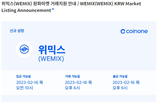 À§¸ÞÀÌµå °¡»óÀÚ»ê À§¹Í½º(WEMIX)°¡ 2¿ù 16ÀÏ ±¹³» °¡»óÀÚ»ê °Å·¡¼Ò ÄÚÀοø¿¡ Àç»óÀåÇÑ´Ù. 2022³â 12¿ù 8ÀÏ ÄÚÀοøÀ» ºñ·ÔÇÑ DAXA(±¹³» µðÁöÅÐ ÀÚ»ê °Å·¡¼Ò °øµ¿ÇùÀÇü, ¾÷ºñÆ®¡¤ºø½æ¡¤ÄÚÀοø¡¤ÄÚºø¡¤°íÆÅ½º)¿¡ ÀÇÇØ °Å·¡ Á¤Áö ¹× »óÀå ÆóÁöµÈ Áö ¾à µÎ ´Þ ¸¸ÀÌ´Ù.