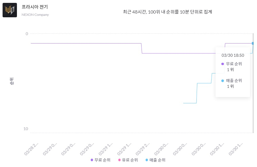³Ø½¼ÀÌ °³¹ßÇÏ°í ¼ºñ½ºÇÏ´Â ½ÅÀÛ MMORPG 'ÇÁ¶ó½Ã¾Æ Àü±â'°¡ 2023³â 3¿ù 30ÀÏ ¿ÀÈÄ 6½Ã 50ºÐ °æ ¾ÖÇà ¾Û½ºÅä¾î ¸ÅÃâ ¼øÀ§ 1À§¿¡ ¿Ã¶ú´Ù. Á¤½Ä Ãâ½Ã ÈÄ ÇÏ·ç°¡ ä Áö³ªÁö ¾ÊÀº ½ÃÁ¡ÀÌ´Ù.