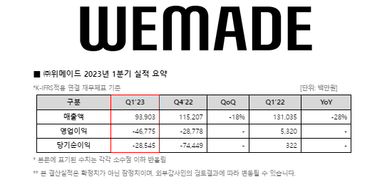 5¿ù 10ÀÏ À§¸ÞÀ̵å 2023³â 1ºÐ±â ½ÇÀû ¹ßÇ¥¿¡ µû¸£¸é ¿¬°á±âÁØ ¸ÅÃâÀº 939¾ï ¿ø, ¿µ¾÷¼Õ½ÇÀº 468¾ï ¿ø, ´ç±â¼ø¼Õ½ÇÀº 285¾ï ¿øÀÌ´Ù. °¢°¢ 2021³â °°Àº ±â°£°ú ºñ±³ÇÏ¸é ¸ÅÃâÀº 28.3% °¨¼ÒÇß°í ¿µ¾÷ÀÌÀÍ¡¤´ç±â¼øÀÌÀÍÀº ÀûÀÚÀüȯÇß´Ù. Àü ºÐ±â¿Í ºñ±³ÇÏ¸é ¸ÅÃâÀº 18.5% ÁÙ¾ú°í ¿µ¾÷¼Õ½Ç ±Ô¸ð´Â ´Ã¾ú´Ù. ´ç±â¼ø¼Õ½ÇÀº Ãà¼ÒµÆ´Ù.