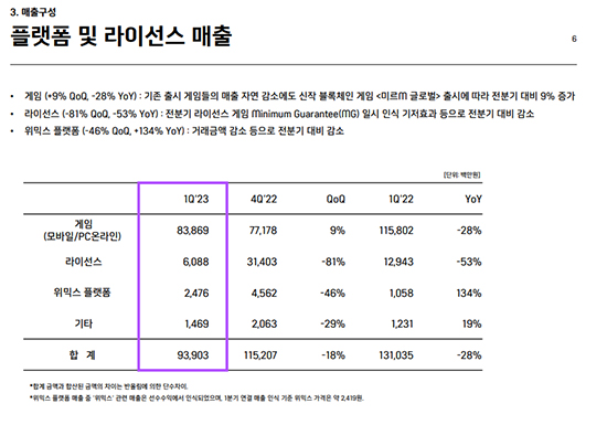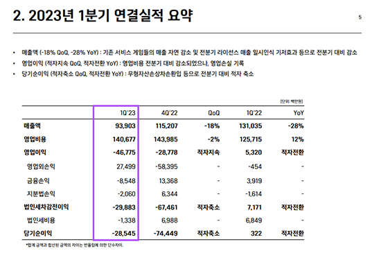 ¸ÅÃâÀº ±âÁ¸ ¼ºñ½º °ÔÀÓ ¸ÅÃâ °¨¼Ò¿Í ¶óÀ̼±½º ¸ÅÃâ °¨¼Ò°¡ ¿µÇâÀ» ¹ÌÃÆ´Ù. ƯÈ÷ ¶óÀ̼±½º °ÔÀÓ ¸ÅÃâÀº Àü ºÐ±â ´ëºñ 81% °¨¼ÒÇß´Ù. ´Ù¸¸, °ÔÀÓ ¸ÅÃâÀº ¡®¹Ì¸£M ±Û·Î¹ú¡¯ Ãâ½Ã¿¡ µû¶ó Àü ºÐ±â ´ëºñ 9% ´Ã¾ú´Ù. ¿µ¾÷¼Õ½ÇÀº Àü ºÐ±â ´ëºñ ¿µ¾÷ºñ¿ëÀÌ 2% ÁÙ¾úÁö¸¸, ¸ÅÃâ °¨¼Ò ¿µÇâÀ¸·Î ÀûÀÚ ÆøÀÌ Ä¿Á³´Ù. ´ç±â¼ø¼Õ½ÇÀº ¹«ÇüÀÚ»ê¼Õ»óÂ÷¼ÕȯÀÔ µîÀ¸·Î Àü ºÐ±â ´ëºñ ÀûÀÚ°¡ ÁÙ¾ú´Ù.