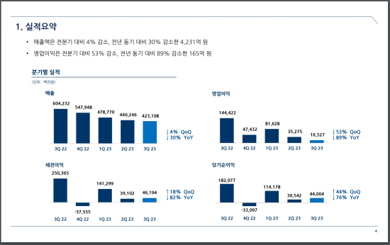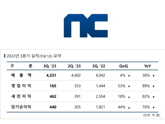 11¿ù 9ÀÏ ¿£¾¾ 2023³â 3ºÐ±â ½ÇÀû ¹ßÇ¥¿¡ µû¸£¸é ¿¬°á ±âÁØ ¸ÅÃâÀº 4,231¾ï ¿øÀ¸·Î Àü³â µ¿±â ºñ±³ 30%, Á÷Àü ºÐ±â ºñ±³ 4% °¨¼ÒÇß´Ù. ¿µ¾÷ÀÌÀÍÀº 162¾ï ¿øÀ¸·Î Àü³â µ¿±â ºñ±³ 89%, Á÷Àü ºÐ±â ºñ±³ 53% °¨¼ÒÇß´Ù. ´ç±â¼øÀÌÀÍÀº 440¾ï ¿øÀ¸·Î Àü³â µ¿±â ºñ±³ 76%, Á÷Àü ºÐ±â ºñ±³ 44% °¨¼ÒÇß´Ù.