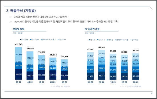 °ÔÀÓº° ¸ÅÃâ·Î´Â '¸®´ÏÁö M'ÀÌ Àü³â µ¿±â ºñ±³ 22.5%¡¤Á÷Àü ºÐ±â ºñ±³ 6.8% °¨¼ÒÇÑ 1,195¾ï ¿ø, '¸®´ÏÁö 2M'ÀÌ Àü³â µ¿±â ºñ±³ 55.8%¡¤Á÷Àü ºÐ±â ºñ±³ 12.9% °¨¼ÒÇÑ 549¾ï ¿ø, 'ºí·¹À̵å & ¼Ò¿ï 2'°¡ Àü³â µ¿±â ºñ±³ 12.4%¡¤Á÷Àü ºÐ±â ºñ±³ 53.7% Áõ°¡ÇÑ 92¾ï ¿ø, '¸®´ÏÁö W'°¡ Àü³â µ¿±â ºñ±³ 54.3%¡¤Á÷Àü ºÐ±â ºñ±³ 14.1% °¨¼ÒÇÑ 901¾ï ¿øÀ» ±â·ÏÇß´Ù. PC ¿Â¶óÀÎ °ÔÀÓÀº Àü³â µ¿±â ºñ±³ 4.2% °¨¼Ò¡¤Á÷Àü ºÐ±â ºñ±³ 6% °¨¼ÒÇÑ 882¾ï ¿øÀ» ±â·ÏÇß´Ù.