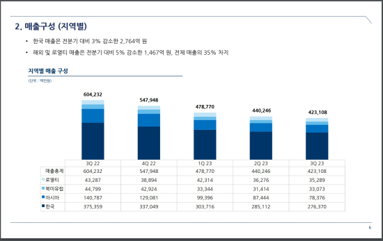 Áö¿ªº°·Î´Â Á÷Àü ºÐ±â¿Í ¸¶Âù°¡Áö·Î Àüü ¸ÅÃâ Áß ¾à 35%°¡·®À» ±Û·Î¹ú ½ÃÀå¿¡¼ ±â·ÏÇß´Ù. Çѱ¹ ½ÃÀå¿¡¼ Àü³â µ¿±â ºñ±³ 26.3%¡¤Á÷Àü ºÐ±â ºñ±³ 3% °¨¼ÒÇÑ 2,763¾ï ¿ø, ¾Æ½Ã¾Æ ½ÃÀå¿¡¼ Àü³â µ¿±â ºñ±³ 44.3%¡¤Á÷Àü ºÐ±â ºñ±³ 10.3% °¨¼ÒÇÑ 783¾ï ¿ø, ºÏ¹Ì¡¤À¯·´ ½ÃÀå¿¡¼ Àü³â µ¿±â ºñ±³ 26.2%¡¤Á÷Àü ºÐ±â ºñ±³ 5.3% °¨¼ÒÇÑ 330¾ï ¿øÀ» ´Þ¼ºÇß´Ù.