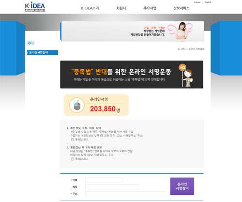ÀÌ´Â K-IDEA¿¡ ¼Ò¼ÓµÇ¾î ÀÖ´Â ³Ø½¼°ú ³×¿ÀÀ§Áî°ÔÀÓÁî, ¿£¾¾¼ÒÇÁÆ®, ³Ý¸¶ºí, À§¸ÞÀ̵å, NHN¿£ÅÍÅ×ÀÎ¸ÕÆ® µî K-IDEA ¼Ò¼Ó 90¿©°³ ȸ¿ø»çµéÀÌ °ÔÀÓ Áßµ¶¹ý ¹Ý´ë È«º¸¿¡ ³ª¼¸ç ÀÚ»ç ȨÆäÀÌÁö¿¡ ¹Ý´ë ¼¸í ¿îµ¿ ÆäÀÌÁöÀÇ ¸µÅ©¸¦ °É¾î À¯ÀúµéÀÇ Âü¿©¸¦ À¯µµÇϰí ÀÖ´Ù.