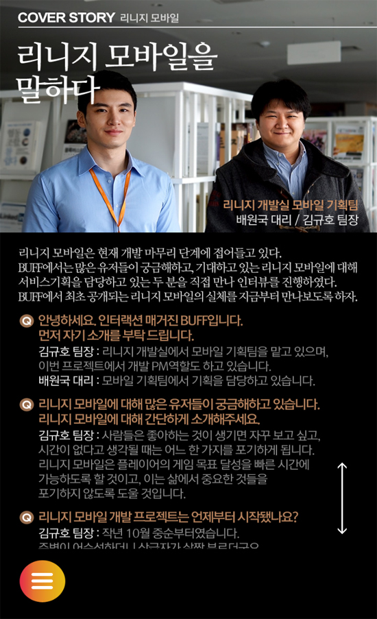 ¸®´ÏÁö ¸ð¹ÙÀÏÀº ÇöÀç °³¹ß ¸¶¹«¸® ´Ü°è¿¡ Á¢¾îµé°í ÀÖ´Ù. BUFF¿¡¼´Â ¸¹Àº À¯ÀúµéÀÌ ±Ã±ÝÇØÇϰí, ±â´ëÇϰí ÀÖ´Â ¸®´ÏÁö ¸ð¹ÙÀÏ¿¡ ´ëÇØ ¼ºñ½º±âȹÀ» ´ã´çÇϰí ÀÖ´Â µÎ ºÐÀ» Á÷Á¢ ¸¸³ª ÀÎÅͺ並 ÁøÇàÇÏ¿´´Ù. BUFF¿¡¼ ÃÖÃÊ °ø°³µÇ´Â ¸®´ÏÁö ¸ð¹ÙÀÏÀÇ ½Çü¸¦ Áö±ÝºÎÅÍ ¸¸³ªº¸µµ·Ï ÇÏÀÚ.