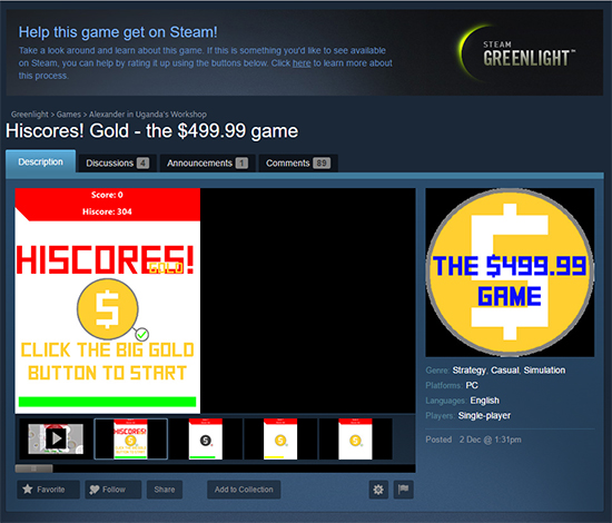 ¹ëºêÀÇ °ÔÀÓ Ç÷§Æû '½ºÆÀ'ÀÇ ÀÔÁ¡ ½Ã½ºÅÛ '±×¸°¶óÀÌÆ®'¿¡ µî·ÏµÈ °ÔÀÓ 'ÇÏÀ̽ºÄÚ¾îÁî! °ñµå(Hiscores! Gold)'°¡ ¹«·Á 499.99 ´Þ·¯(¾à 58¸¸ ¿ø)¶ó´Â Ȳ´çÇÑ °¡°ÝÀ¸·Î µî·ÏµÇ¾î ³í¶õÀÌ µÇ°í ÀÖ´Ù.