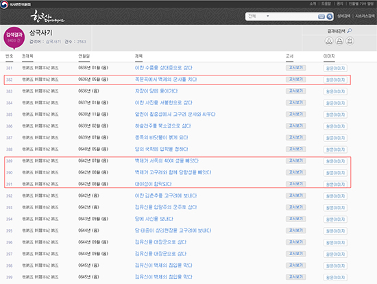 ¡®»ï±¹»ç±â¡¯¿¡¼µµ °ü·Ã ³»¿ëÀ» È®ÀÎÇÒ ¼ö Àִµ¥, ÀçÀ§ 5³â(636³â) ¿Á¹®°î¿¡¼ ¹éÁ¦±ºÀ» ¹°¸®Ä£ ³»¿ë°ú ÀçÀ§ 16³â(647³â) ¹Ý¶õÀÌ ÀÏ¾î³ ³»¿ëÀÌ´Ù. ¶ÇÇÑ, ÀçÀ§ 1³â(632³â) ¹é¼ºµéÀ» ÁøÈá(±¸Á¦)Çϰųª ½Å±Ã¿¡ Á¦»ç¸¦ Áö³»°í ÀçÀ§ 3³â(634³â) ºÐȲ»ç, ÀçÀ§ 4³â(635³â) ¿µ¹¦»ç, ÀçÀ§ 14³â(644³â) Ȳ·æ»çžÀ» â°ÇÇÑ Á¡Àº 2K°¡ ¾ð±ÞÇÑ ³»¿ë°ú µ¿ÀÏÇÑ ºÎºÐÀÌ´Ù.