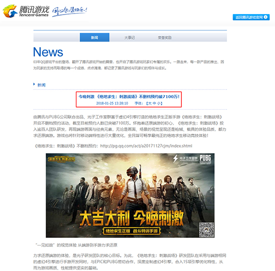 ÅÙ¼¾Æ®´Â Áö³ÇØ 11¿ù 27ÀÏ °ø½Ä º¸µµÀڷḦ ÅëÇØ ÆàÁöÁÖ½Äȸ»ç¿Í Çù¾÷ÇÑ ¡®¹èƲ±×¶ó¿îµå ¸ð¹ÙÀÏ¡¯ °³¹ß ¼Ò½ÄÀ» ÀüÇß´Ù. ÀÌÈÄ ÅÙ¼¾Æ®´Â 12¿ù 1ÀÏ ¡®ÅÙ¼¾Æ® °ÔÀÓ Ä«´Ï¹ß 2017(Tencent Game Carnival 2017, ÀÌÇÏ TGC 2017)¡¯¿¡¼ °³¹ß ÁßÀÎ ¡®¹èƲ±×¶ó¿îµå ¸ð¹ÙÀÏ¡¯ 2Á¾À» °ø°³ÇÏ°í »çÀü ¿¹¾àÀ» ½ÃÀÛÇß´Ù. °ø°³µÈ °ÔÀÓÀº ¡®ÀýÁö±¸»ý: Àü±ºÃâ°Ý(绝ò¢Ï´ßæ: îï军õó击, ÀÌÇÏ Àü±ºÃâ°Ý)¡¯°ú ¡®ÀýÁö±¸»ý: ÀÚ°ÝÀüÀå(绝ò¢Ï´ßæ: í©Ì战场, ÀÌÇÏ ÀÚ°ÝÀüÀå)¡¯ÀÌ´Ù.