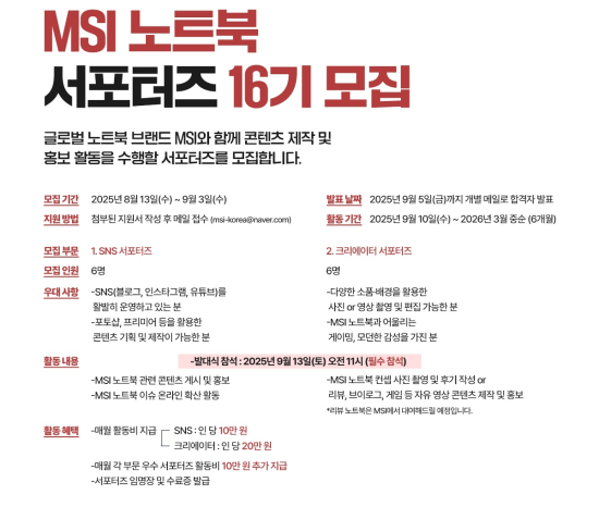 MSI ³ëÆ®ºÏ ¼Æ÷ÅÍÁî´Â ÃֽŠMSI ³ëÆ®ºÏÀ» ±â¹ÝÀ¸·Î ÄÜÅÙÃ÷ Á¦ÀÛ°ú ¿Â¶óÀÎ È«º¸ Ȱµ¿À» ÁøÇàÇϸç, ¹«»ó Á¦Ç° üÇè, ÄÜÅÙÃ÷ Á¦ÀÛ Áö¿ø, °ø½Ä Çà»ç ÃÊû µî ´Ù¾çÇÑ ÇýÅÃÀ» ¹Þ´Â´Ù. ¸ðÁý ºÎ¹®Àº ¡ãSNS ¼Æ÷ÅÍÁî 6¸í ¡ãÅ©¸®¿¡ÀÌÅÍ ¼Æ÷ÅÍÁî 6¸í µî ÃÑ 12¸íÀÌ´Ù.