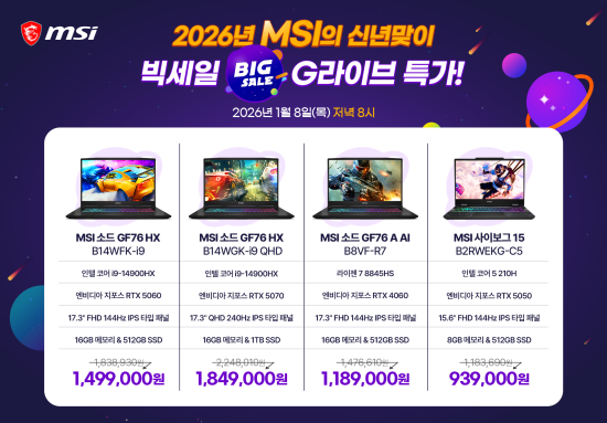 À̹ø ¶óÀÌºê ¹æ¼ÛÀ» ÅëÇØ ¡ã¼Òµå GF76 HX B14WFK-i9 ¡ã¼Òµå GF76 HX B14WGK-i9 QHD ¡ã¼Òµå GF76 A AI B8VF-R7 ¡ã»çÀ̺¸±× 15 B2RWEKG-C5 µî ÃÑ 4Á¾ÀÇ Àα⠰ÔÀÌ¹Ö ³ëÆ®ºÏÀ» ¼±º¸ÀδÙ. '¼Òµå GF76 HX' 2Á¾Àº ÀÎÅÚ ÄÚ¾î i9 ÇÁ·Î¼¼¼¿Í RTX 50 ½Ã¸®Áî ±×·¡ÇÈÀ» ±â¹ÝÀ¸·Î ´ëȸ鿡¼ ¾ÈÁ¤ÀûÀÎ °í¼º´É °ÔÀÌ¹Ö È¯°æÀ» Á¦°øÇϸç, º£½ºÆ®¼¿·¯ ¸ðµ¨ÀÎ '¼Òµå GF76 A AI'´Â AMD ¶óÀÌÁ¨ 7 ÇÁ·Î¼¼¼¸¦ ÅëÇØ ¼º´É°ú ½Ç¿ë¼ºÀÇ ±ÕÇüÀ» °ÈÇß´Ù. ´ëÇлý¿¡°Ô Àα⠳ôÀº '»çÀ̺¸±× 15'´Â °¡º±°í ¼¼·ÃµÈ µðÀÚÀο¡ RTX ±×·¡ÇÈÀ» ´õÇØ ÇÕ¸®ÀûÀÎ °¡°Ý´ëÀÇ °ÔÀÌ¹Ö ³ëÆ®ºÏÀ¸·Î Á¦½ÃµÈ´Ù.