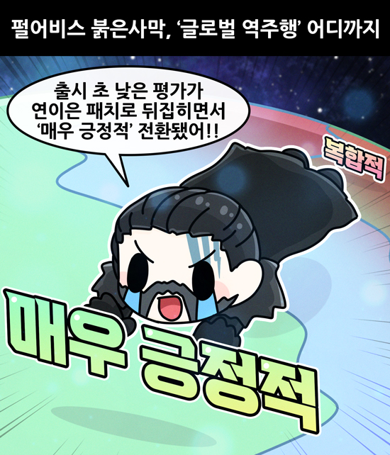 ÆÞ¾îºñ½º ¿ÀÇ ¿ùµå ¾×¼Ç ¾îµåº¥Ã³ ¡®ºÓÀº»ç¸·¡¯ÀÌ Ãâ½Ã ÃÊ ³·Àº Æò°¡¸¦ µó°í ¡®±Û·Î¹ú ¿ªÁÖÇ࡯¿¡ ³ª¼¹´Ù. Ãâ½Ã ù³¯ PC ½ºÆÀ(Steam) Çѱ¹¾î Æò°¡´Â ¡®´ëü·Î ºÎÁ¤Àû(39% ±àÁ¤)¡¯¿¡ ¸Ó¹°·¶°í, ±Û·Î¹ú Æò°¡´Â ¡®º¹ÇÕÀû(40% ±àÁ¤)¡¯¿¡ ±×ÃÆÀ¸³ª, ¿¬ÀÌÀº ÆÐÄ¡·Î Çѱ¹¾î´Â ¡®´ëü·Î ±àÁ¤Àû(70% ±àÁ¤)¡¯, ±Û·Î¹úÀº ¡®¸Å¿ì ±àÁ¤Àû(80% ±àÁ¤)¡¯À¸·Î ÀüȯµÆ´Ù. 3¿ù 30ÀÏ¿¡´Â ½ºÆÀ ÃÖ°í µ¿½Ã Á¢¼ÓÀÚ ¼ö 27¸¸ ¸íÀ» ³Ñ°Ü Ãâ½Ã ÀÌÈÄ ÃÖ°í ¼öÄ¡¸¦ »õ·Î ½è´Ù.