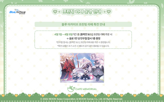 ¿ÀÇÁ¶óÀÎ »ó¼³ ÆË¾÷ ½ºÅä¾î 'Ä«Æä ¸Þ¸ð¸®¾ó'¿¡¼µµ ¸¸¿ìÀý À̺¥Æ®¸¦ ¸¸³¯ ¼ö ÀÖ´Ù. 4¿ù 1ÀϺÎÅÍ 5ÀϱîÁö ÃÑ·ÂÀü º¸½º°¡ ÇÁ¸°ÆÃµÈ ±â°£ ÇÑÁ¤ À½·á ¸Þ´º¸¦ ÆÇ¸ÅÇϸç, ÇØ´ç ¸Þ´º¸¦ ÁÖ¹®ÇÑ À¯Àú¿¡°Ô ƯÀü ¿±¼¸¦ ÁõÁ¤ÇÑ´Ù. ¸¶Áö¸·³¯ÀÎ 4¿ù 5ÀÏ¿¡´Â ÄÚ½ºÇÁ·¹¸¦ Çϰí Ä«Æä¿¡ ¹æ¹®ÇÑ À¯Àú Áß ¼±Âø¼ø 20¸í¿¡°Ô ÇØ´ç ¸Þ´º¸¦ ¹«»ó Á¦°øÇÏ´Â À̺¥Æ®µµ ÁøÇàµÈ´Ù.