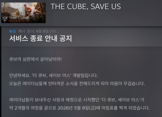 ¿¢½º¿¤°ÔÀÓÁî°¡ °³¹ßÇÏ°í ¼ºñ½ºÇÏ´Â Æ÷½ºÆ® ¾ÆÆ÷Ä®¸³½º ÀͽºÆ®·¢¼Ç ¾×¼Ç °ÔÀÓ '´õ Å¥ºê, ¼¼ÀÌºê ¾î½º'°¡ 4¿ù 8ÀÏ °øÁö¸¦ ÅëÇØ ¼ºñ½º Á¾·á¸¦ ¿¹°íÇß´Ù. 3¿ù 18ÀÏ ±Û·Î¹ú PC °ÔÀÌ¹Ö Ç÷§Æû ½ºÆÀ(Steam)À» ÅëÇØ ¾Õ¼ ÇØº¸±â(¾ó¸® ¾×¼¼½º)·Î Ãâ½ÃµÈ Áö ¾à 2ÁÖ ¸¸ÀÌ´Ù.